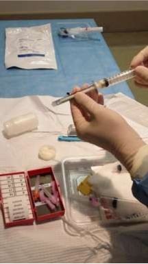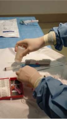 CT-guided Lung Biopsy Technique : Track Embolization Pre-intervention Acquisition Guide Needle Placement / Biopsy Mixing of the hemostat gelatin powder with 6 cc normal saline Back-loading of mixture into 1 cc syringe At the conclusion of